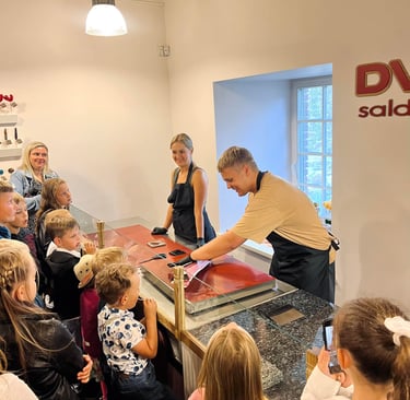 Saldainių gamybos edukacija - tai laabai smagus procesas, trukantis apie 45 minutes (viena pamoka, kaip ir priklauso). Edukacijos metu pamatysite, kaip gimsta saldainis nuo pradžios iki pabaigos. Proceso metu iš viso pasigaminate apie 60 saldainių ir juos visus pasiimate kartu su savimi. Dalyvauti gali iki 15-os žmonių, vaikučiai nuo 5 metukų jau susigaudo kas ir kaip. Turime nuostabią edukatorę - Algimantę, kuri jau turi 5 metus patirties tiek su vaikučiais, tiek su senjorais.